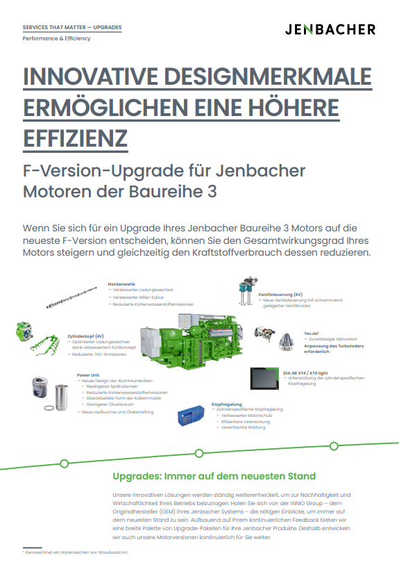 Wenn Sie sich für ein Upgrade Ihres Jenbacher Baureihen 4B oder 4C Motors auf die neueste E-Versionstechnologie entscheiden, können Sie den Gesamtwirkungsgrad Ihres Motors steigern und gleichzeitig den Kraftstoffverbrauch dessen reduzieren