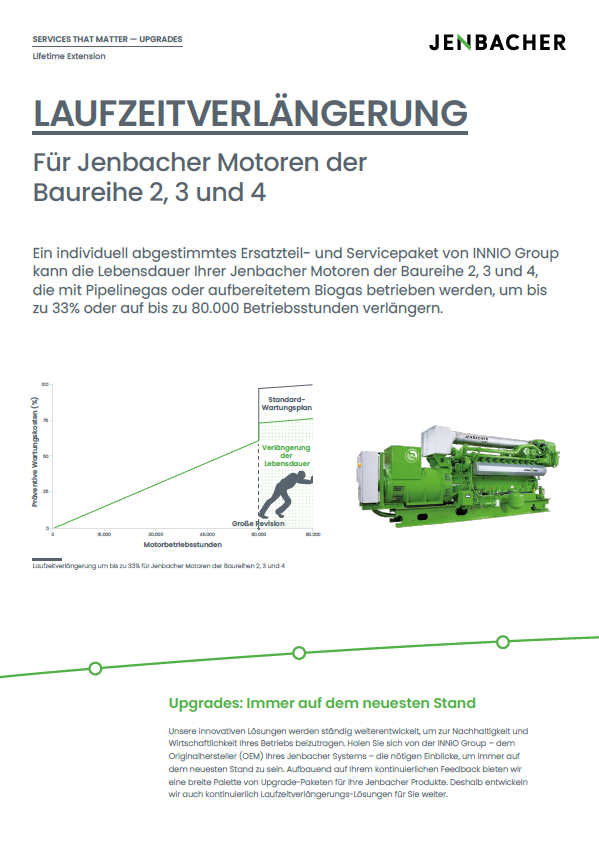 Mit dem maßgeschneiderten INNIO Group Ersatzteil- und Servicepaket ist eine Verlängerung der Lebensdauer der Jenbacher Motoren der Baureihen 2 und 3, die mit Erdgas bzw. aufbereitetem Biogas betrieben werden, um bis zu 25 % bzw. 75.000 Betriebsstunden möglich. Standardpreis für das Light-Paket verfügbar. Projektspezifischer Preis für das Full-Paket und die optionalen Komponenten.