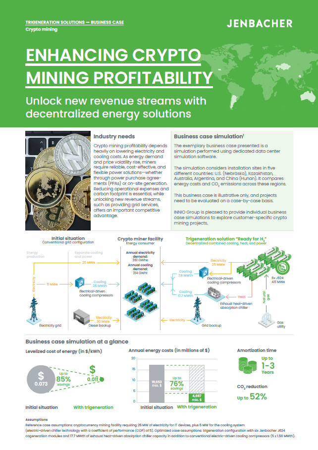 Cryptocurrency mining’s rapid growth is driving unprecedented energy demand and operational costs. Profitability relies on minimizing electricity and cooling expenses but rising energy demand and price volatility make this increasingly challenging. Miners need reliable, cost-effective, and flexible power—Jenbacher solutions deliver efficient, flexible energy that helps maximize profitability, reduce your carbon footprint, and unlock new revenue streams such as grid services for a valuable competitive edge.