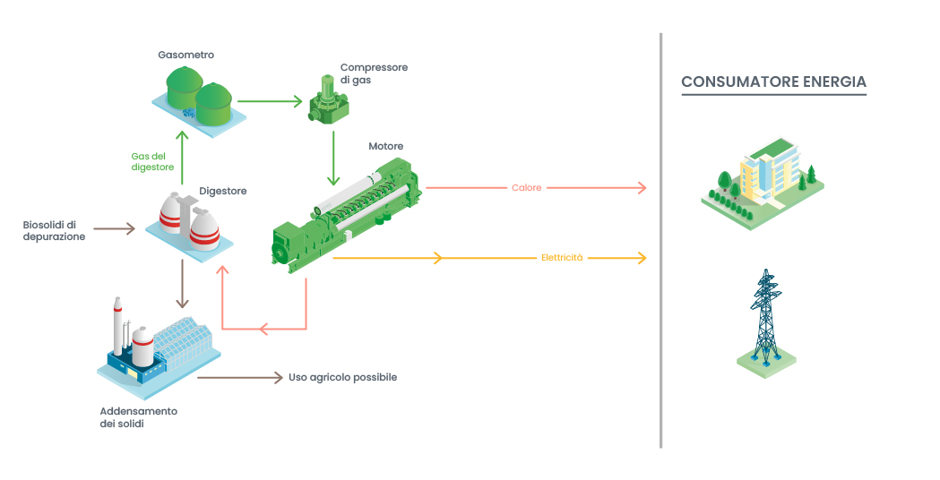 Jenbacher offre una soluzione per i costi operativi in aumento. In impianti che utilizzano la digestione anaerobica per il trattamento dei biosolidi, il gas di depurazione prodotto può essere usato per produrre elettricità. Con l’utilizzo di motori a gas moderni, questa fonte di energia rinnovabile può essere convertita in elettricità in modo efficiente ed affidabile. Ciò soddisfa fino all’80% (100%) del fabbisogno di elettricità dell’impianto ed elimina la necessità di usare combustibili fossili per il riscaldamento dell’impianto.