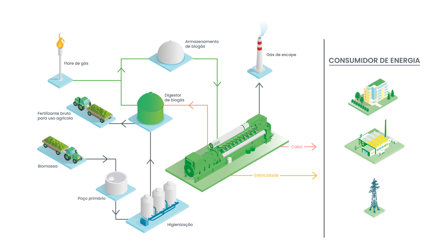 Em vez de produzir resíduos que geram emissões, os resíduos orgânicos — também denominados biomassa — podem ser usados como uma fonte de energia valiosa quando transformados em biogás. E o uso do biogás para abastecer motores como um substituto dos combustíveis fósseis está aumentando em todo o mercado de energia. Isso porque essa fonte de energia renovável complementa outras fontes de energia renováveis, como a eólica e a solar — com uma grande diferença. Não depende das condições atmosféricas!